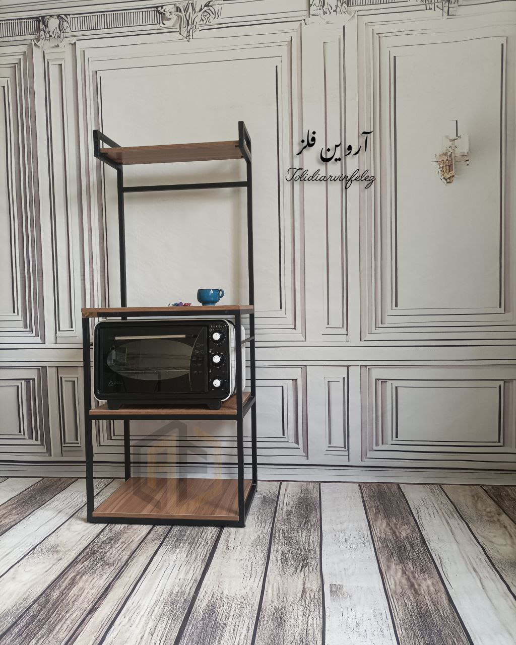 • طراحی مدرن و کاربردی شلف ایستاده چوب و فلز